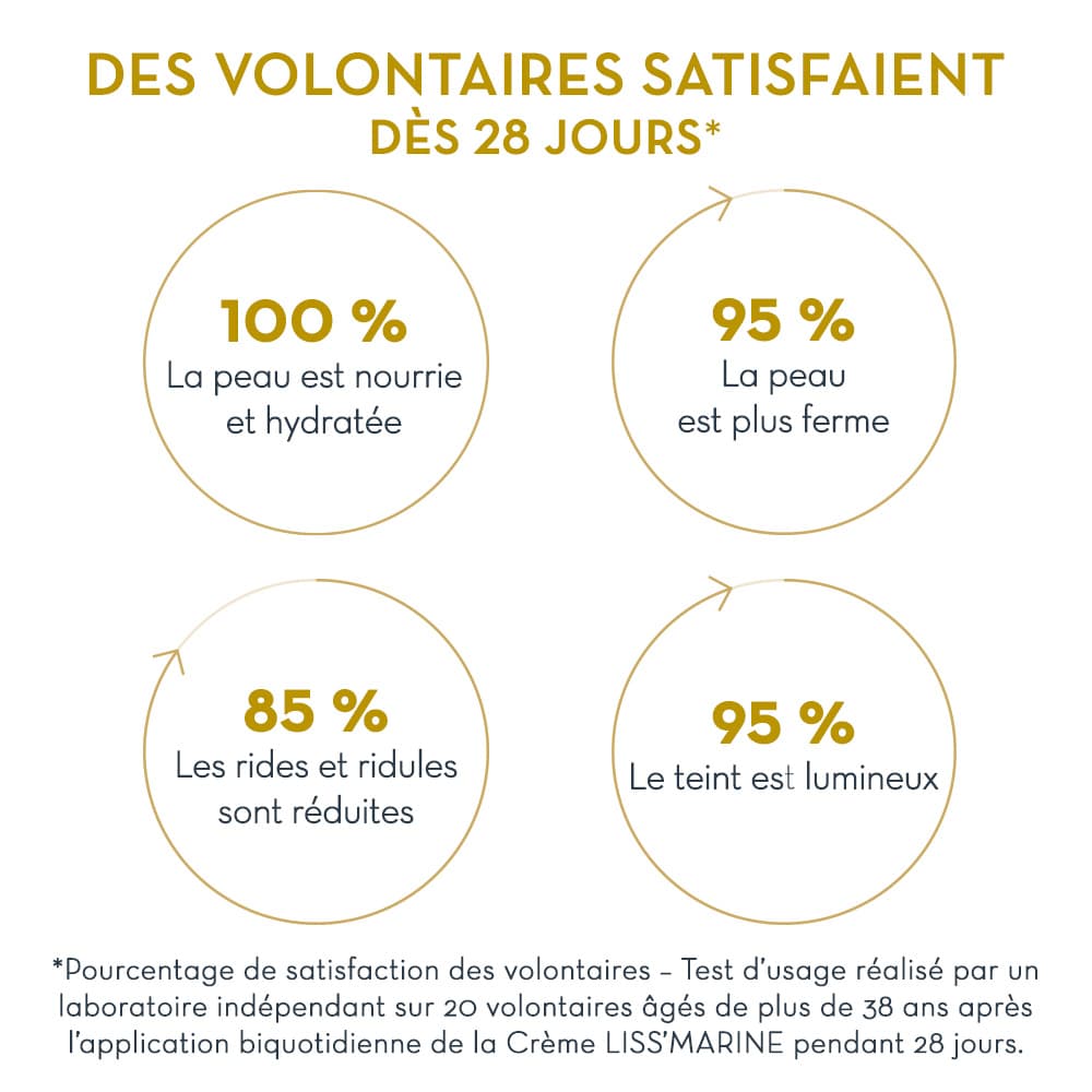 **Pourcentage de satisfaction des volontaires – Test d’usage réalisé par un laboratoire indépendant sur 20 volontaires âgés de plus de 38 ans après l’application biquotidienne de la Crème Liss’Marine pendant 28 jours.